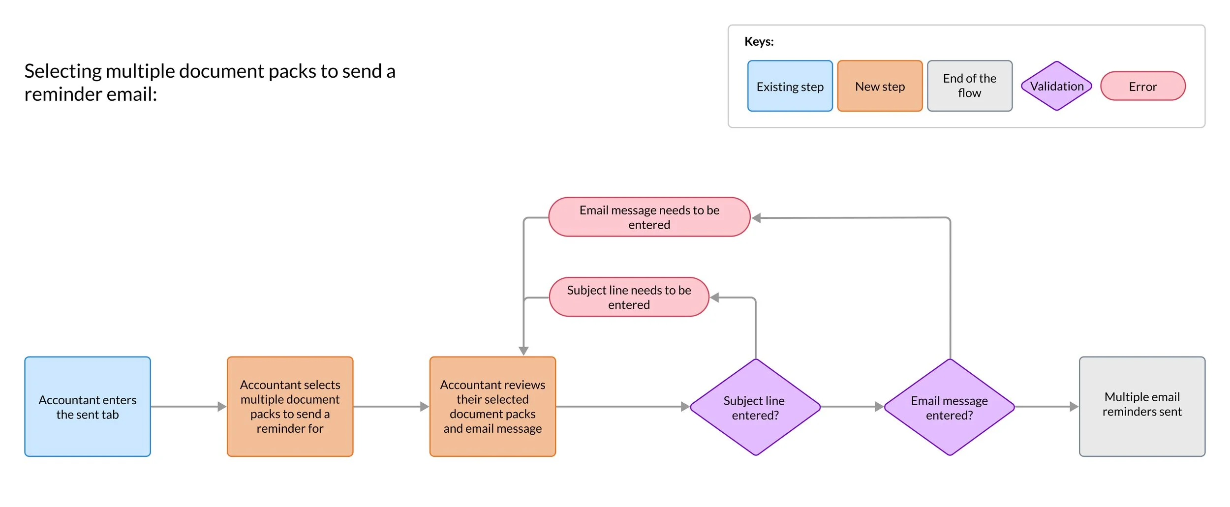 When accountants send out documents for clients to sign with Xero’s E-sign feature called Document Packs, they can send reminder emails to clients that need to sign outstanding documents. However, they could only send reminder emails per document one by one. This was causing accountants to do a lot of extra admin work that took time away from their main tasks.