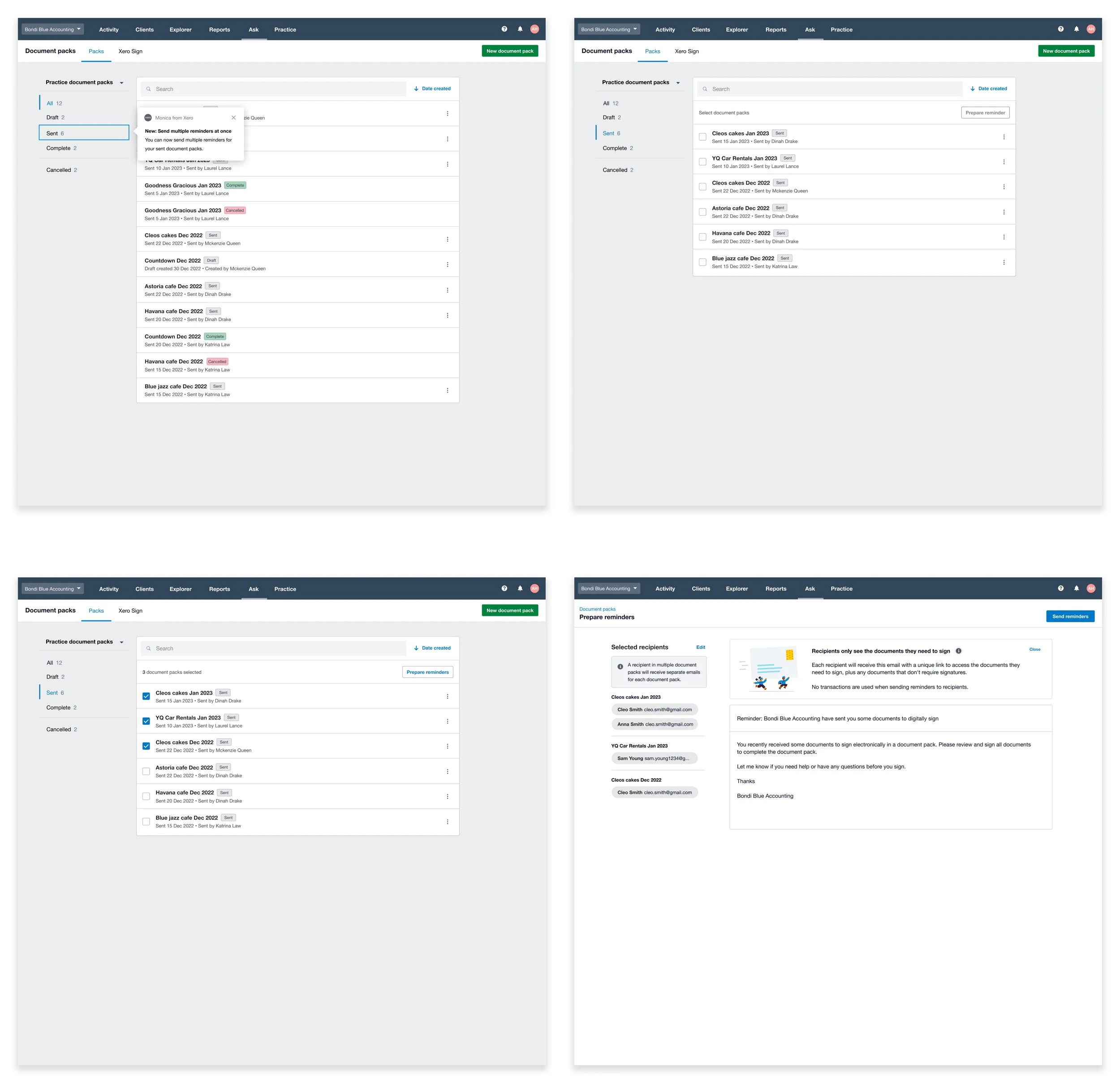 Bulk reminders is a bulk actions feature to allow Accountants to send multiple email reminders to clients that have outstanding documents that need signing when using Xero’s E-sign feature Document Packs.