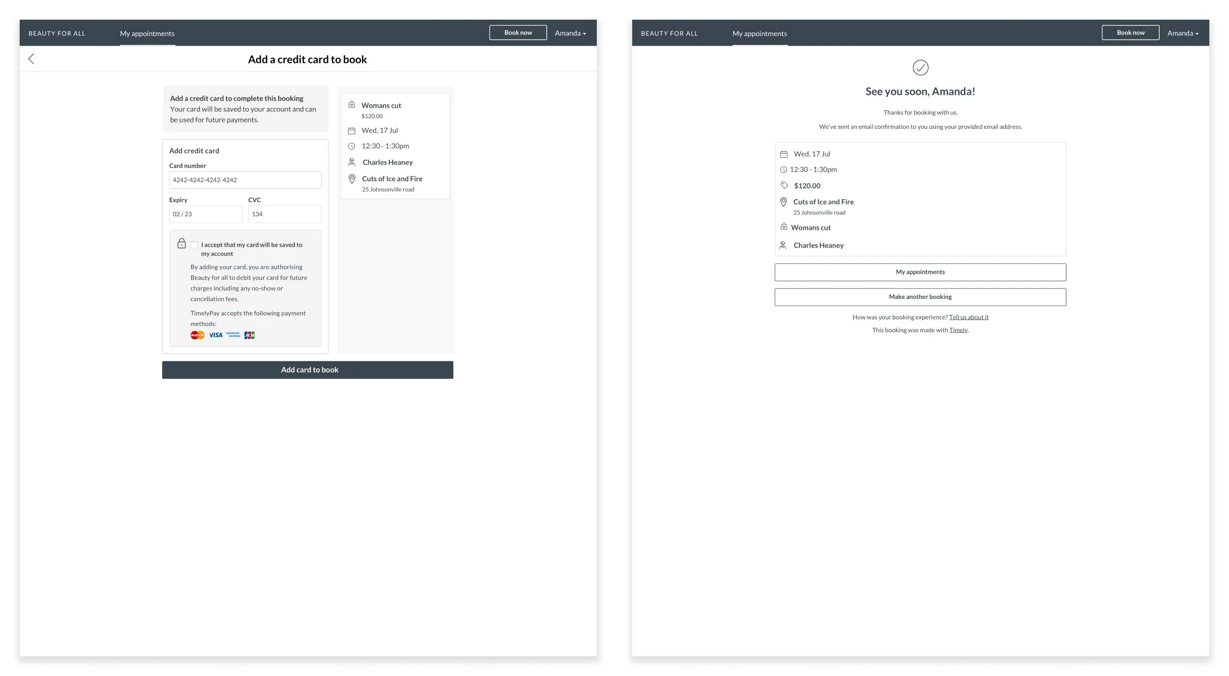 Customers also wanted a way to save credit card details on the main platform even if clients hadn’t made a booking yet so they can have these details in future to charge