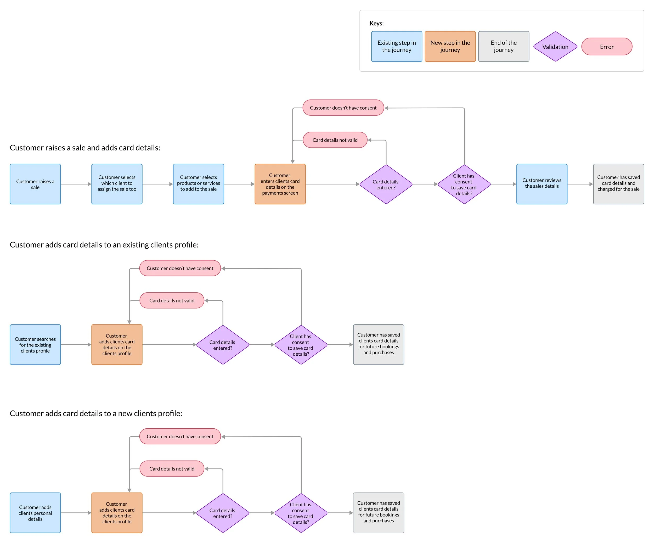 I identified key scenarios where we should allow customers to save credit card details. The main user flows we identified to allow users to add credit card details were: